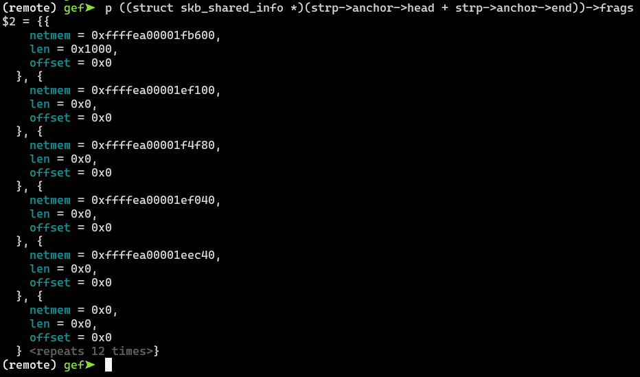 - Setup a TLS socket. This will cause strp->anchorto be allocated, and the shared info structure should allocate on top of one of the previously sprayed SKB's shared info structures. This means that thefragsarray will contain a stale pointer in the 6th fragment.
